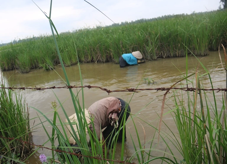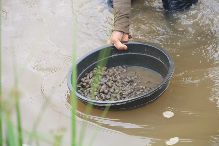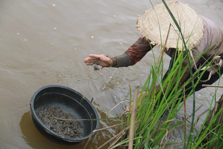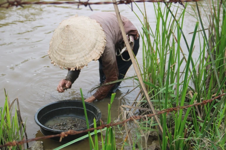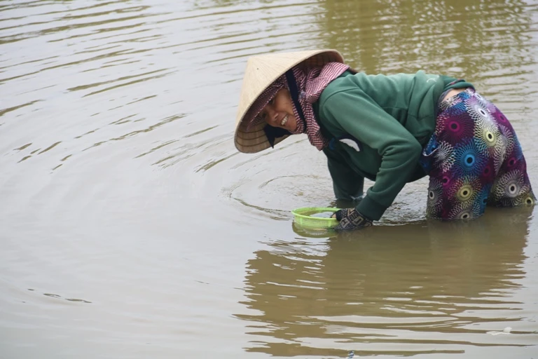 Còn có những người phụ nữ trung niên mò ốc để cải thiện kinh tế gia đình. Khi có ốc, họ cùng gọi nhau đến.