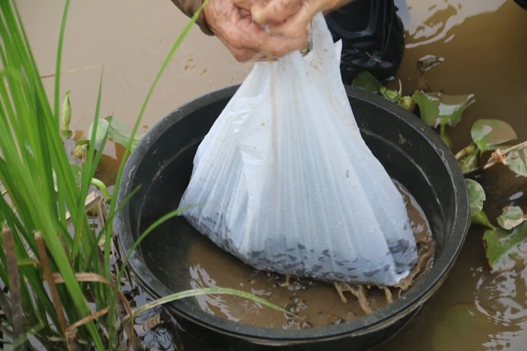 Đằng sau bà Liền là một cụ bà khác. Đưa chúng tôi xem thau ốc, cụ bà than mình già rồi không làm được gì nên tranh thủ đến mùa ốc thì đi bắt kiếm tiền. "Cả ngày mò dưới bùn ngập mặt như ri giỏi lắm được 7-8 kg ốc chứ mấy, bán được cao lắm cũng khoảng 80.000-90.000 đồng", cụ nói.
