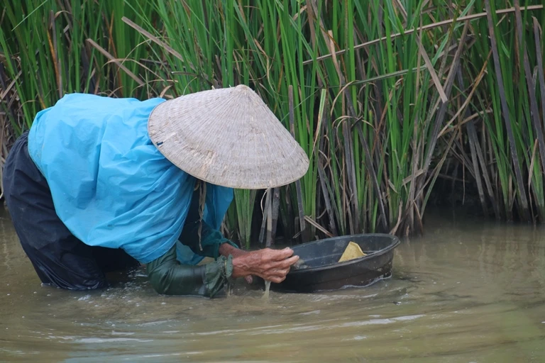 Sáng sớm 1-4, trên khúc sông Cồn Thầy (xã Bình An, huyện Thăng Bình, Quảng Nam), một số phụ nữ lớn tuổi bắt đầu công việc.