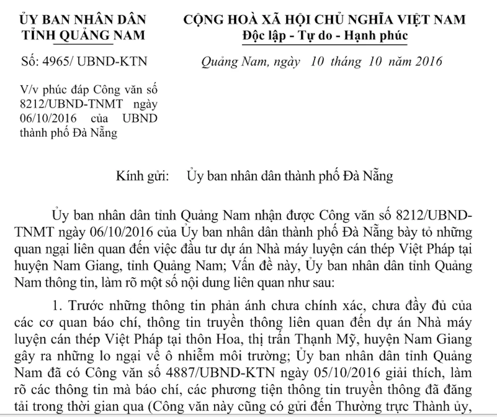 Phúc đáp vấn đề này, ông Toàn cho hay, trước những thông tin phản ánh chưa chính xác, chưa đầy đủ của các cơ quan báo chí, thông tin truyền thông liên quan đến dự án Nhà máy luyện cán thép Việt Pháp gây ra những lo ngại về ô nhiễm môi trường, UBND tỉnh Quảng Nam đã có công văn giải thích, làm rõ các thông tin mà báo chí đã đăng tải.
