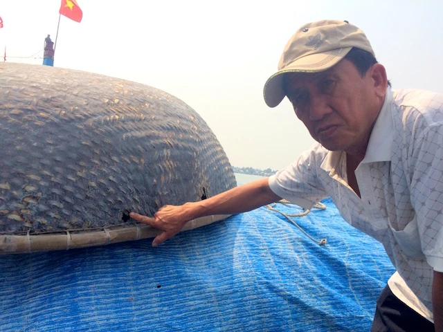 Nhiều lỗ thủng trên thúng chai do bị tàu Trung Quốc bắn. Ảnh Quang Nam