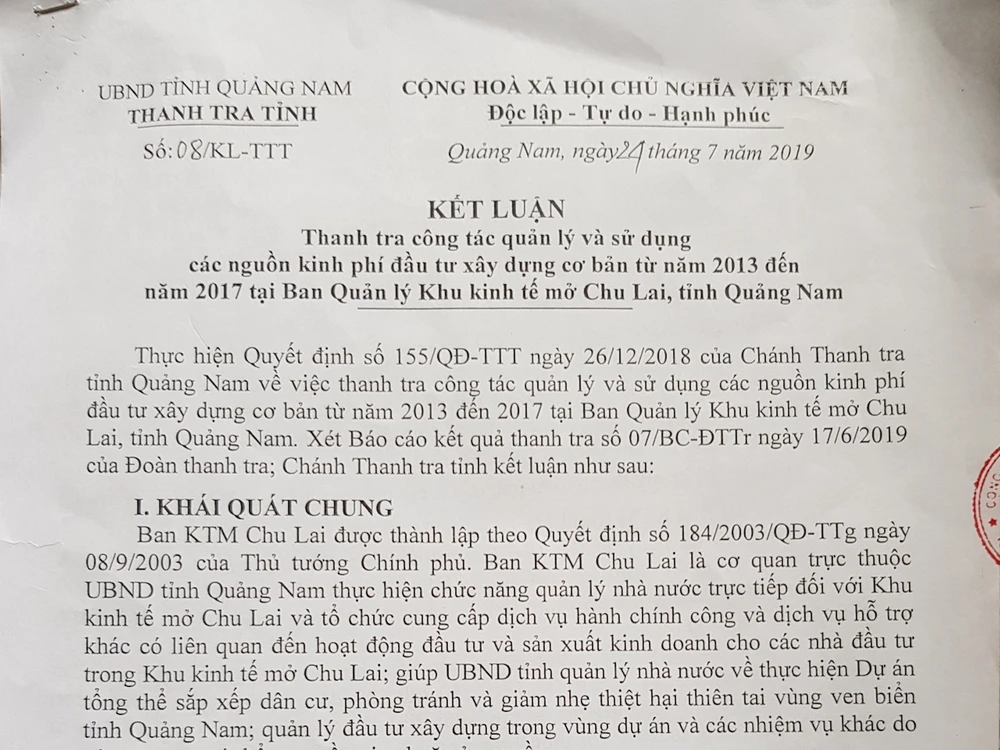 Kết luận thanh tra chỉ ra các sai phạm tại Ban quản lý Khu kinh tế mở Chu Lai. Ảnh: THANH NHẬT