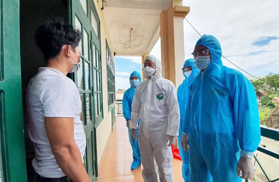 Chủ tịch Quảng Nam Lê Trí Thanh (đồ bảo hộ màu trắng) trong lần đi thăm người dân được đón từ TP.HCM về quê tránh dịch COVID-19. Ảnh: TN