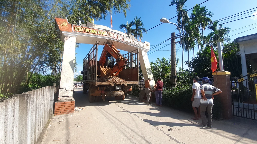 Đến 15 giờ 40 ngày 27-12, lực lượng chức năng huyện Núi Thành, tỉnh Quảng Nam vẫn đang phong toả hiện trường, xử lý vụ xe tải va chạm với cổng chào gây gãy đổ, giao thông ách tắc.