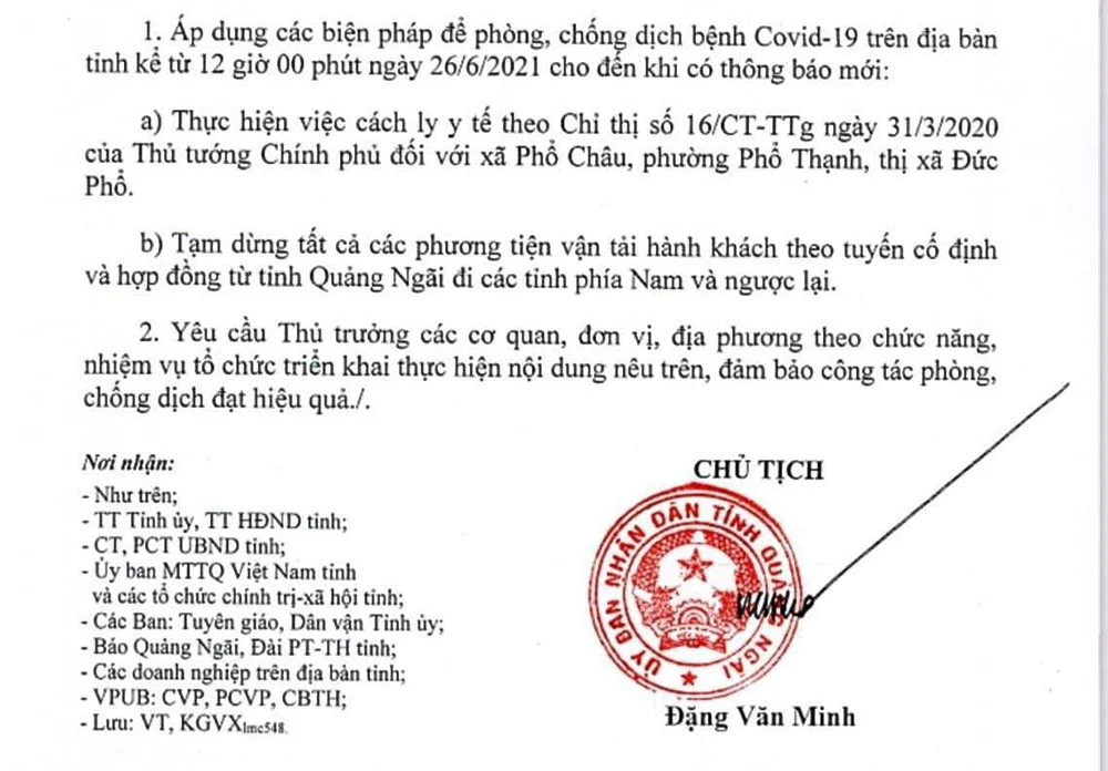 Trước tình hình diễn biến dịch phức tạp, từ trưa 26-6, Chủ tịch tỉnh Quảng Ngãi có văn bản hỏa tốc, chỉ đạo các cơ quan liên quan thực hiện cách ly phường Phổ Thạnh và xã Phổ Châu theo Chỉ thị 16 của Thủ tướng.