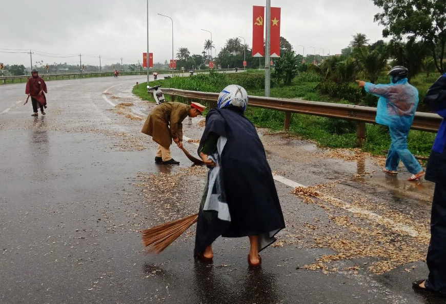 Công an huyện Mộ Đức đã huy động cán bộ chiến sỹ trong đơn vị cùng người dân quét dọn sạch số dăm gỗ rơi vãi trên.