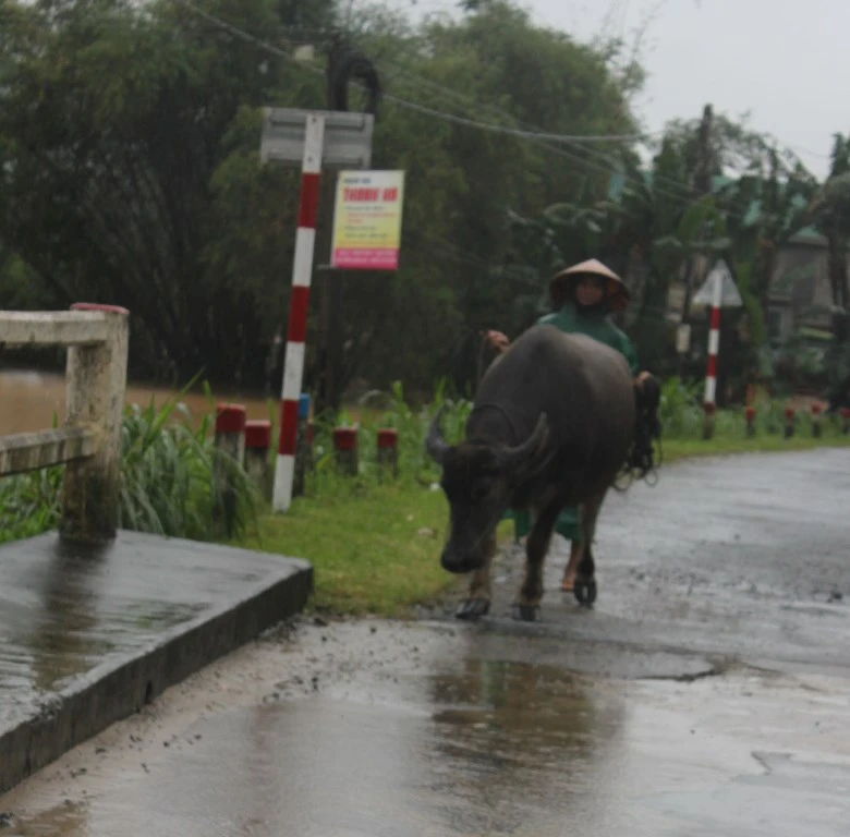 Ông Phan Đình Cúc, ở thôn Phú Lâm Tây, đánh bò lên cầu Cộng Hòa nói: “Quá mệt mỏi vì chạy lũ rồi. Nhưng cũng phải cố gắng dắt con trâu lên đó mà tránh lũ”.