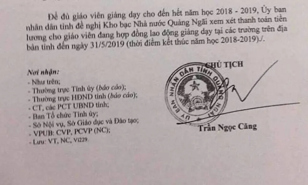 Ngày 29-4, theo tìm hiểu của chúng tôi, Chủ tịch tỉnh Quảng Ngãi Trần Ngọc Căng đã có văn bản đề nghị Kho bạc Nhà nước tỉnh này xem xét chi trả lương cho giáo viên hợp đồng giảng dạy ở các trường trên địa bàn tỉnh đến hết ngày 31-5, kết thúc năm học 2018-2019.