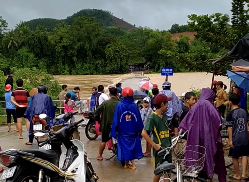 Nước lũ tràn qua cầu sông Rin, thị trấn Di Lăng, huyện Sơn Hà. Ảnh: TẤN VIỆT