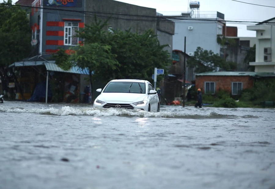 Mưa lớn kéo dài, đường phố bị ngập khiến các phương tiện đi lại gặp khó.