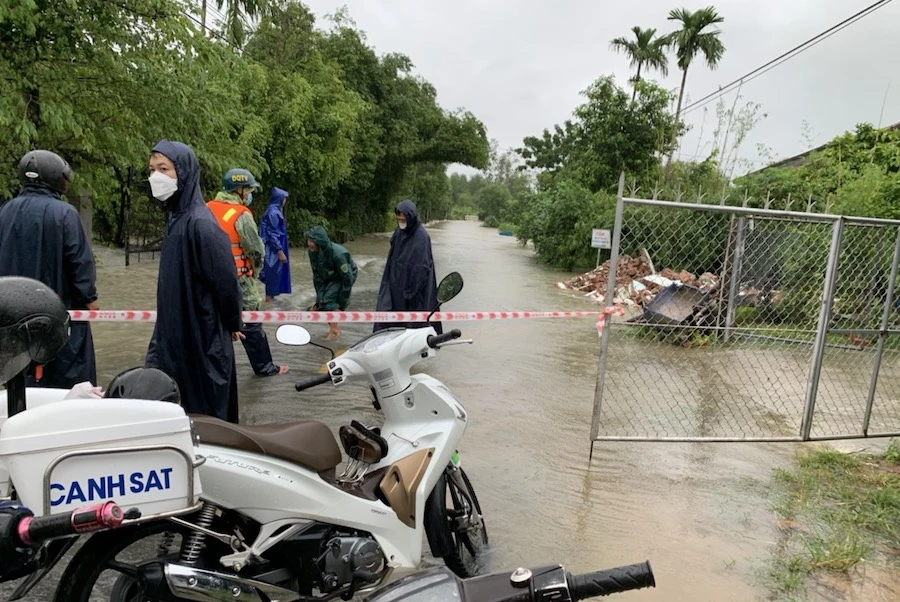 Lực lượng chức năng giăng dây cấm người dân qua lại đoạn đường ngập.