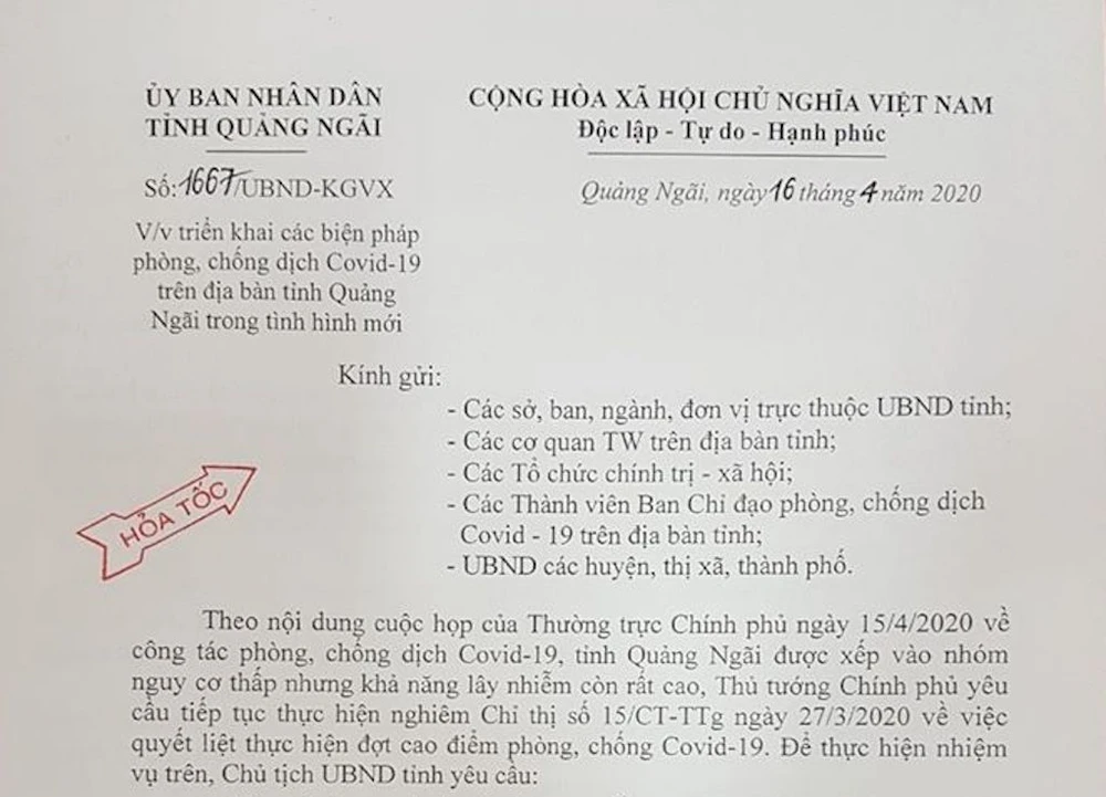 Ngày 16-4, UBND tỉnh Quảng Ngãi có văn bản về việc triển khai các biện pháp phòng, chống dịch COVID-19 trên địa bàn.