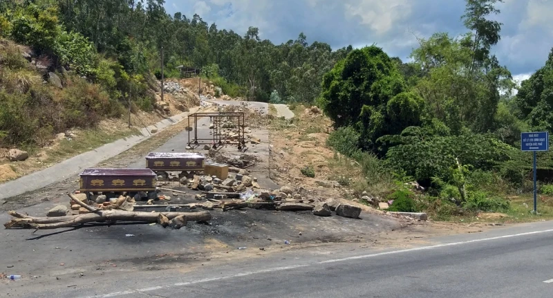 Nhà máy xử lý rác thải Sa Huỳnh bị người dân dựng quan tài chặn đường vào giữa năm 2018. Ảnh: TẤN VIỆT