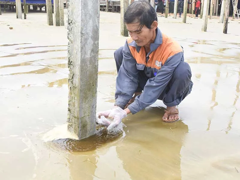 “Nước biển hằng năm vào mùa đông cũng có bọt nước nâu đen nhưng năm nay đậm hơn nhiều. Lại có váng màu đen đóng lại. Những năm trước, nước có ngả màu đen nâu nhưng không đóng váng lại nhiều như vậy” - ông Khắc nói.