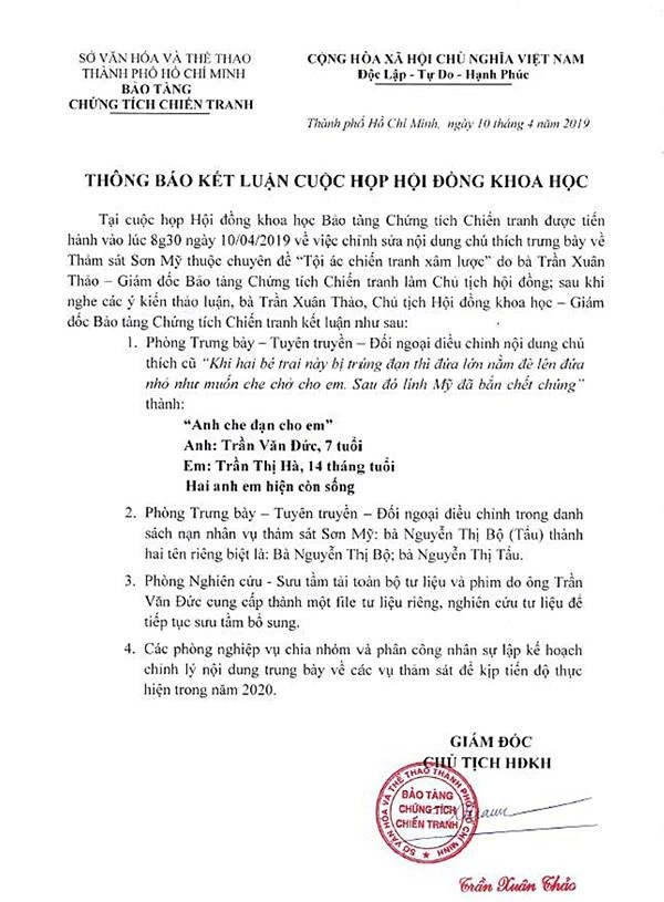 “Chỉ đạo Sở VH-TT TP HCM rút kinh nghiệm đối với bà Trần Xuân Thảo, Giám đốc Bảo tàng chứng tích chiến tranh, vì đã đưa ra một số kết luận không có cơ sở khoa học và thực tiễn có liên quan đến vụ thảm sát Sơn Mỹ”, công văn nêu.