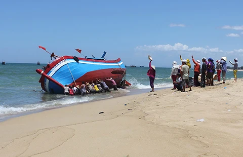Đơn cử, trưa 14-7, hàng trăm người đổ dồn về chiếc tàu cá của ngư dân Võ Văn Vinh bị gió nồm cuốn neo đẩy vào bờ rồi sóng đánh làm cho nghiêng ngả, cabin tàu bị vỡ. Khi anh Vinh kêu cứu, mọi người vội vàng hỗ trợ kéo con tàu ra. Không chỉ có tàu của anh Vinh bị sự cố này, tháng 6-2015, tàu của ngư dân Phạm Hoanh cũng bị bừa neo rồi sóng đánh chìm.