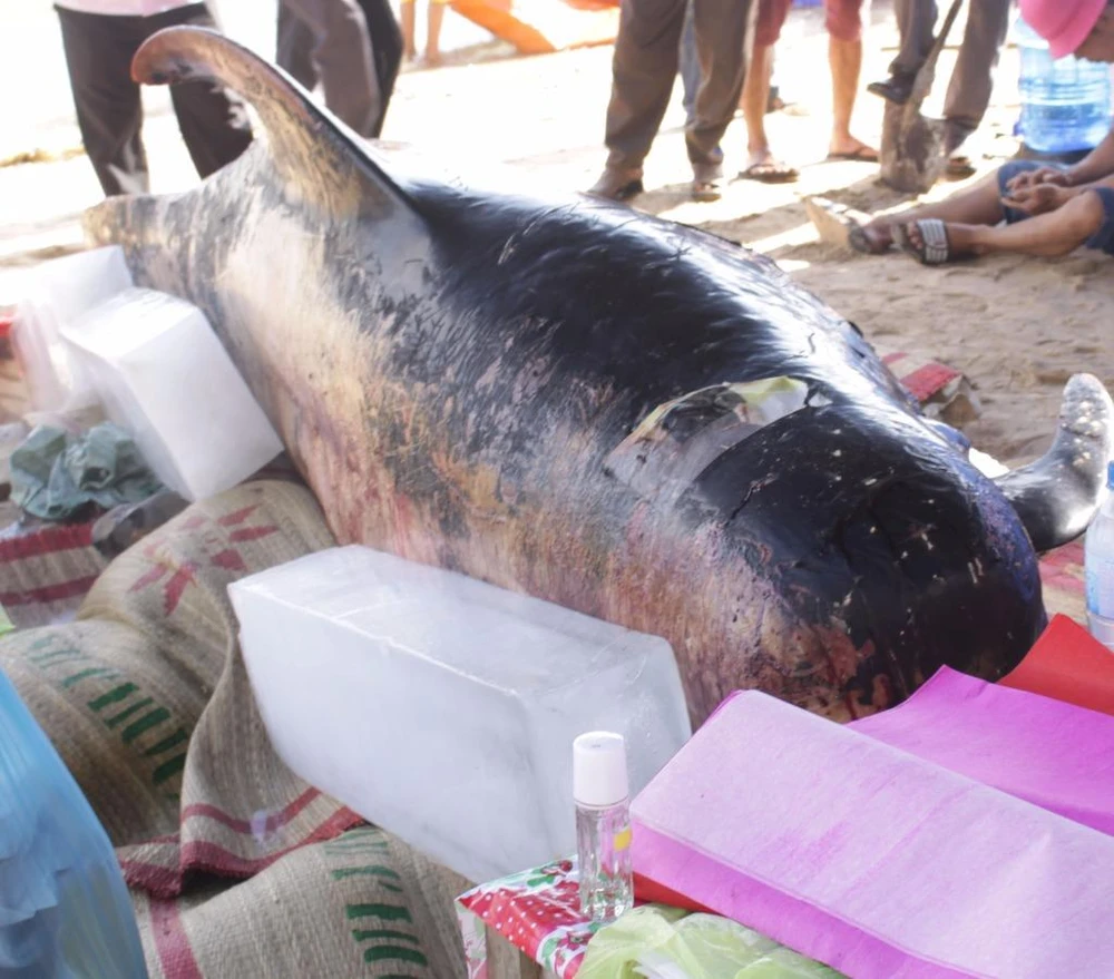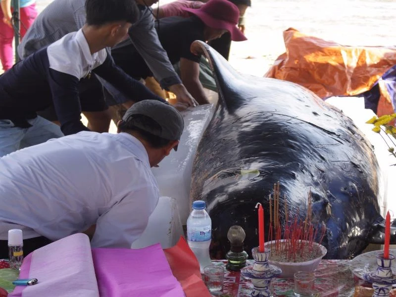 Cá voi ở xã biển Bình Hải trước giờ đi táng. Ảnh V.QUÝ