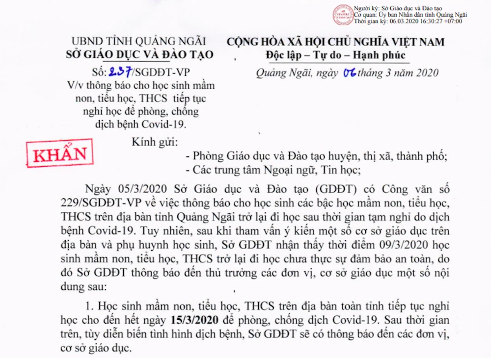 Trước đó, ngày 2-3, tỉnh Quảng Ngãi cho học sinh bậc THPT đi học trở lại sau kỳ nghỉ tránh dịch COVID-19 kéo dài. Đến ngày 5-3, Sở GD&ĐT tỉnh Quảng Ngãi phát thông báo cho học sinh toàn tỉnh đi học trở lại vào ngày 9-3.