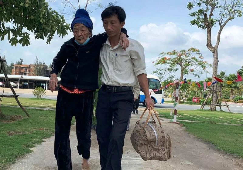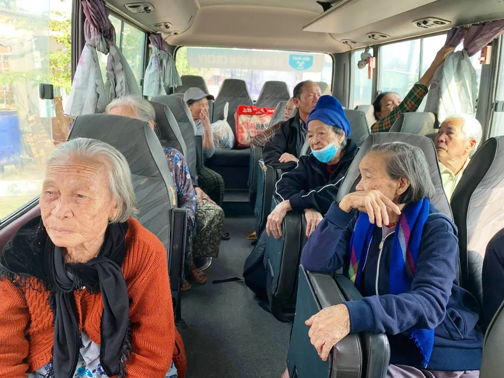 Nhiều người già đang đi trên xe khách để đến nơi trú bão.