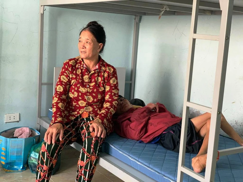 Lực lượng chức năng dìu cụ bà vào Ký túc xá tránh bão.