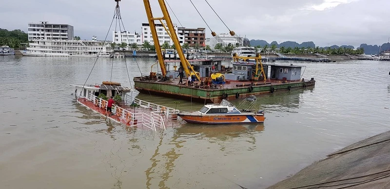 Tàu du lịch bị chìm đang được trục vớt.