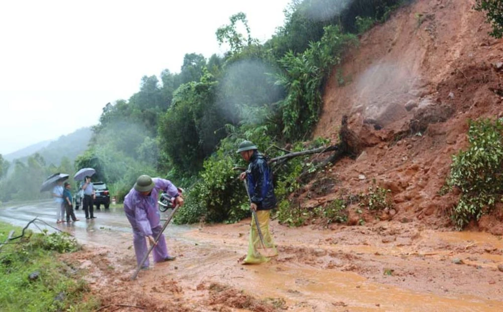 Huyện Bình Liêu huy động lực lượng khắc phục các điểm sạt lở. Ảnh: HG