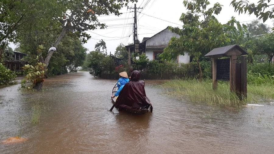 Người dân ở huyện Quảng Điền những nơi thấp trũng đi lại bằng thuyền.