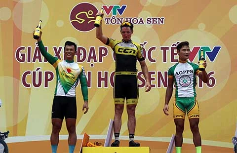 Áo vàng Quàng Văn Cường (phải) đang cùng xe đạp An Giang tạo nên thế lực trên đường đua. ẢNH: MQ