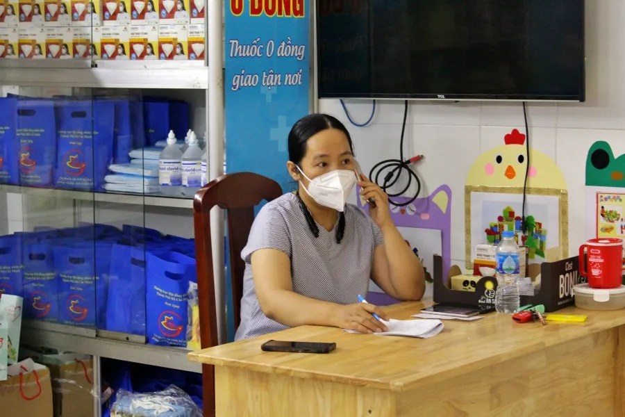 Quầy thuốc 0 đồng đặt tại trường Mầm non phường 9 (480 đường Nguyễn Tri Phương, phường 9, quận 10). Tại đây, dược sĩ Hồ Mộng Trinh, tình nguyện viên (TNV) trực đường dây nóng của quầy thuốc liên tục nhận cuộc gọi nhờ hỗ trợ từ người dân.