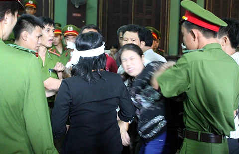 Cảnh sát tư pháp và cán bộ tòa án đang khuyên giải người nhà bị cáo bớt bức xúc, la lối sau phán quyết của HĐXX. Ảnh: PL