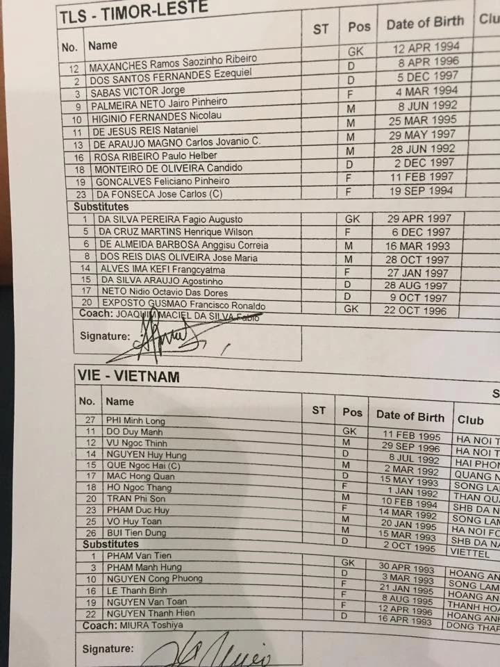 U23 Đông Timor:Maxanches, Dos Santos, Sabas Victor, Neto, Higinio Fernandes, De Jesus Reis, Araujo Magno, Rosa Ribeiro, Monteiro, Goncalves, Da Fonseca.