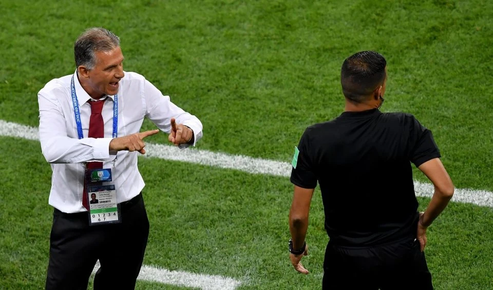 Nhà cầm quân Iran Carlos Queiroz bức xúc trước phán quyết của trọng tài. ẢNH: AP