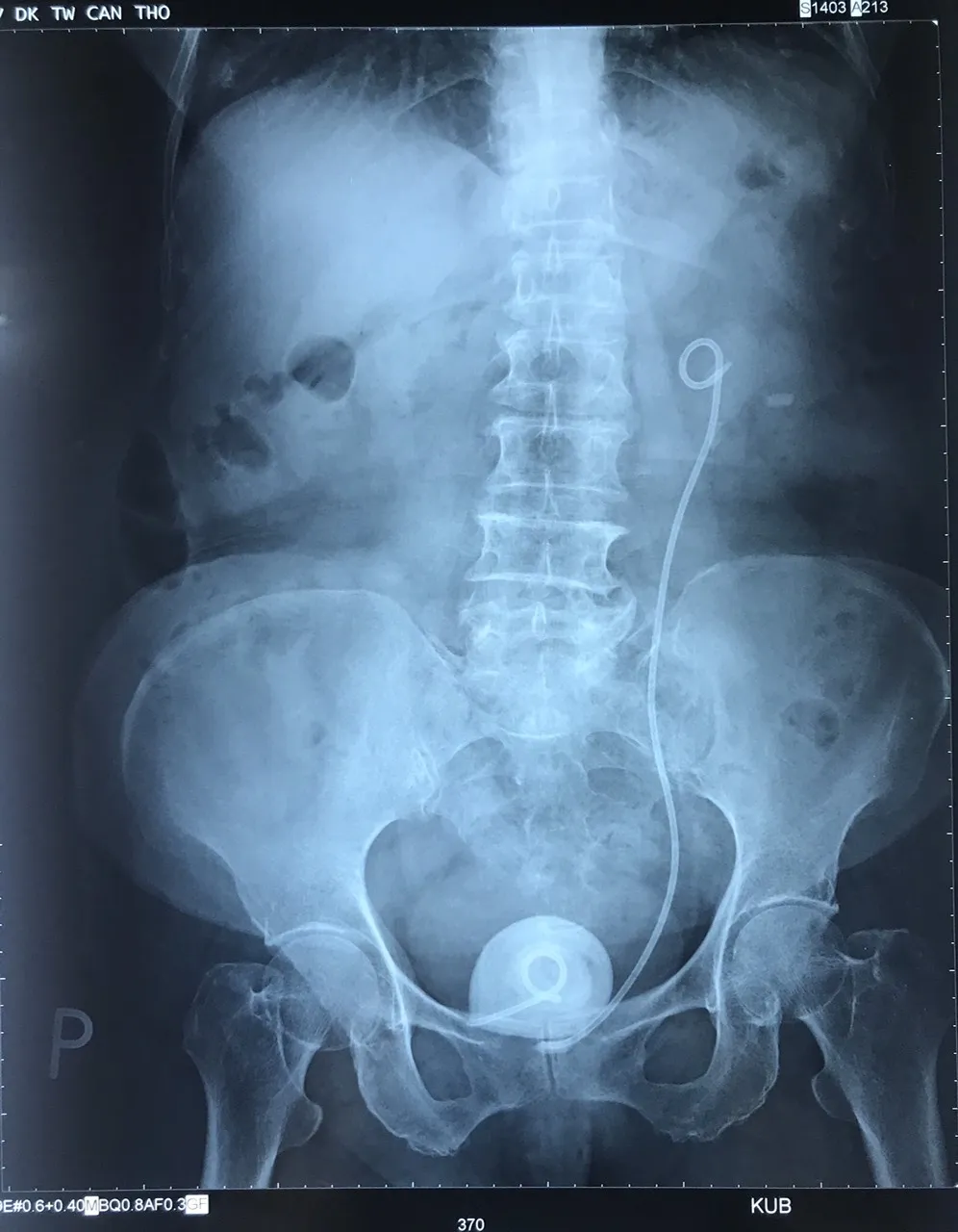 Viên sỏi bàng quang lớn bằng quả trứng và ống thông trên phim chụp X-quang. Ảnh: Hải Dương