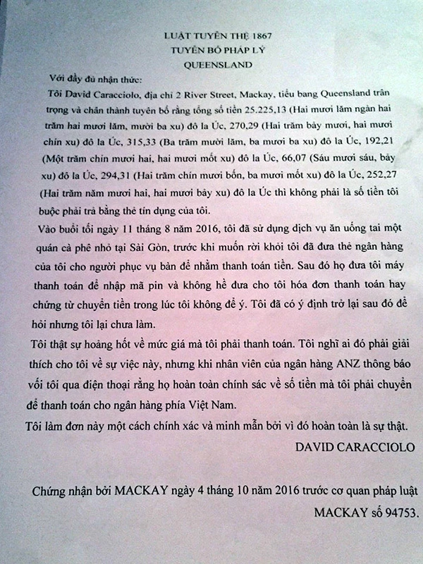 Phía cơ quan CSĐT cũng đề nghị ông Caracciolo David John trực tiếp đến Cơ quan CSĐT để trình báo hoặc có đơn yêu cầu xử lý (có xác nhận cơ quan chức năng xác nhận chứng thực lãnh sự) trình bày rõ, chính xác nội dung vụ việc (Thời gian, địa điểm, nội dung diễn biến trước và sau của sự việc, người chứng kiến, biết việc, người nhận thẻ, quẹt thẻ, nhập mã pin; số tiền bị chiếm đoạt, hình thức thanh toán, những điểm nghi vấn...).