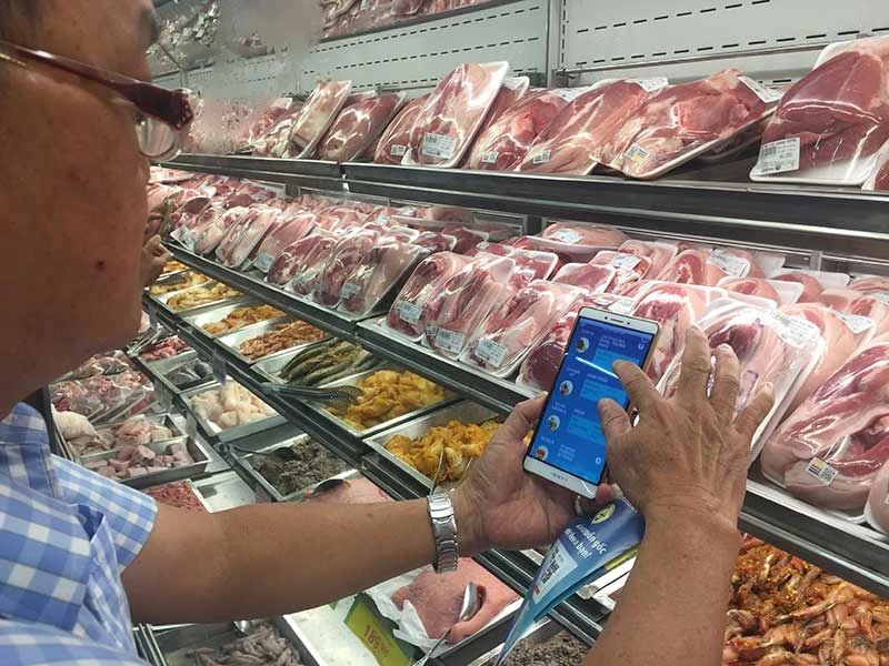 Người tiêu dùng truy xuất nguồn gốc trước khi chọn mua thịt. Ảnh: TÚ UYÊN
