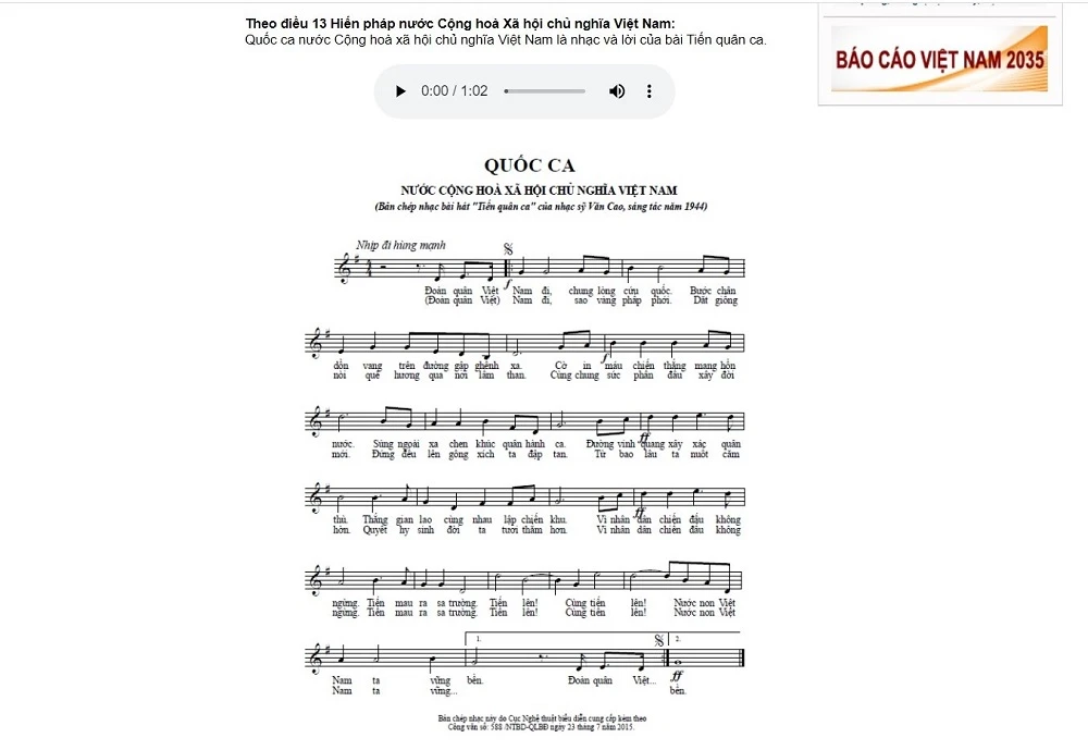 Nhạc và lời của bài Tiến quân ca được công bố trên Chinhphu.vn. Ảnh chụp màn hình.