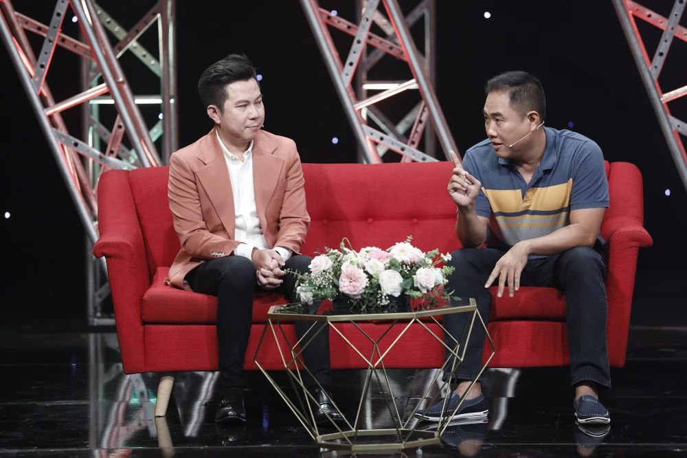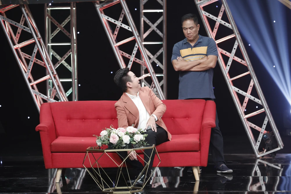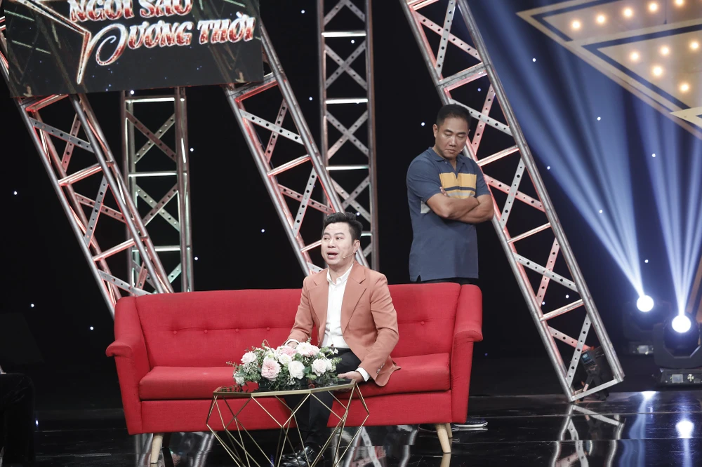 Nhạc sĩ Minh Vy bất ngờ xuất hiện và “nghe lén” cuộc trò chuyện của Quốc Đại và MC Thanh Bạch. Ảnh: SEN VÀNG