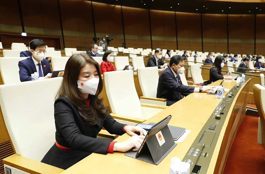 Đại biểu Quốc hội biểu quyết thông qua Nghị quyết về chính sách tài khóa, tiền tệ để hỗ trợ Chương trình phục hồi và phát triển kinh tế - xã hội. Ảnh: TTXVN