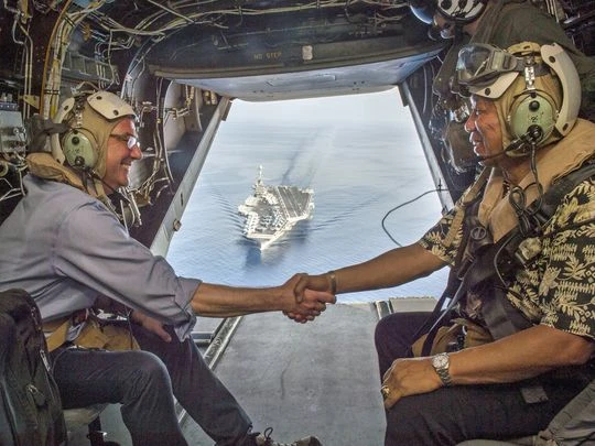 Bộ trưởng Quốc phòng Mỹ Ash Carter (trái) trong một chuyến thăm tàu sân bay USS C. Stennis ngày 15-4-2016. Ảnh: MILITARY TIMES