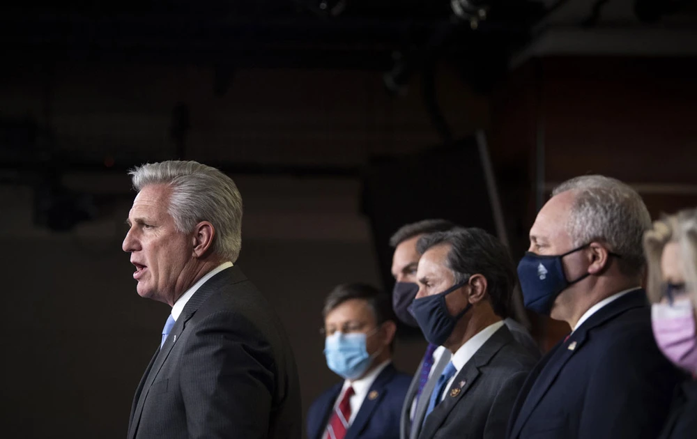 Lãnh đạo phe Cộng hòa ở Hạ viện Kevin McCarthy (trái) cùng một số thành viên Cộng hòa cấp cao khác trong một cuộc họp báo ở QH ngày 28-12-2020. Ảnh: CNBC