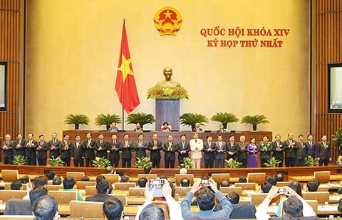 Thủ tướng Nguyễn Xuân Phúc, các phó thủ tướng, các bộ trưởng và các thành viên Chính phủ ra mắt Quốc hội khóa XIV. Ảnh: Trọng Đức - TTXVN