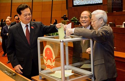 Các đại biểu QH đang bỏ phiếu phê chuẩn danh sách phó chủ tịch và ba ủy viên Hội đồng Quốc phòng và An ninh theo đề nghị của Chủ tịch nước Trần Đại Quang. Ảnh: QH