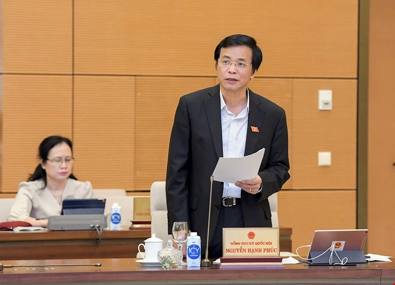 Tổng thư ký Quốc hội Nguyễn Hạnh Phúc trình bày một số vấn đề về việc chuẩn bị kỳ họp thứ 11, Quốc hội khoá XIV. Ảnh: quochoi.vn