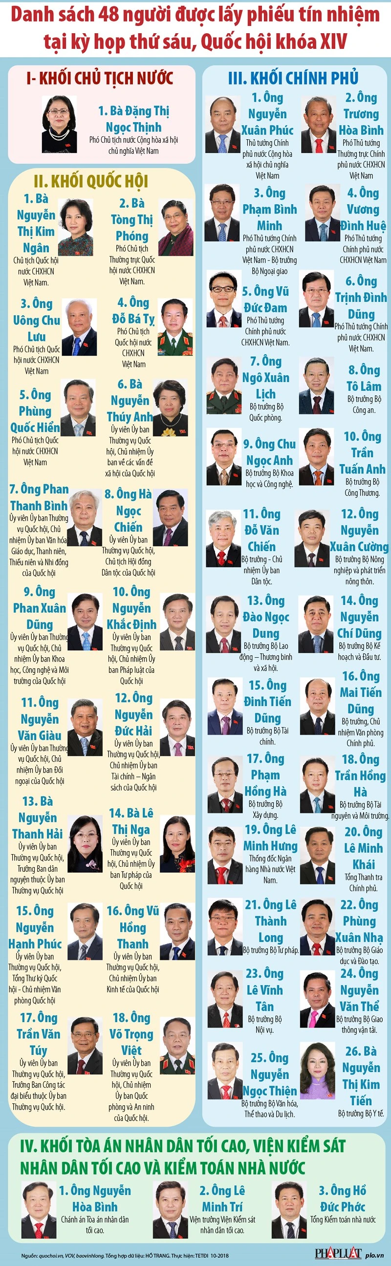 Trong số này, khối Chủ tịch nước có một người, khối QH có 18 người, khối Chính phủ có 26 người cùng với chánh án TAND Tối cao, viện trưởng VKSND Tối cao và tổng Kiểm toán Nhà nước.