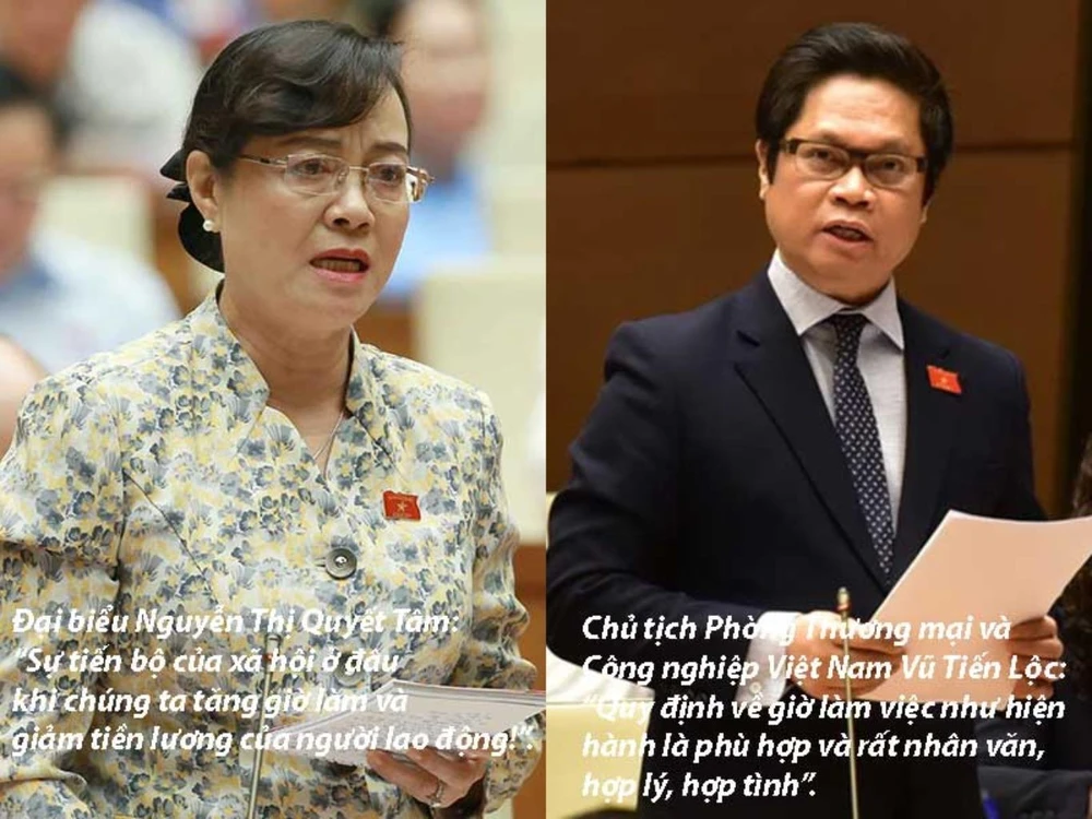Bà Quyết Tâm sau đó đề nghị QH cần phải có chính sách để người công nhân có thu nhập đủ trang trải cuộc sống, có thời giờ để học tập, nâng cao tay nghề, chăm sóc bản thân, gia đình và thực hiện các quan hệ xã hội. “Đó là quyền con người được hiến pháp quy định” - bà Tâm nhấn mạnh. “Sự tiến bộ của xã hội ở đâu khi chúng ta tăng giờ làm và giảm tiền lương của người lao động. Chúng ta giảm còn 44 giờ có nghĩa là 4 giờ còn lại người lao động có thể làm thêm và sẽ tăng thu nhập. Đó là tiến bộ, nhân văn cũng là ở đó” - bà Tâm nói.