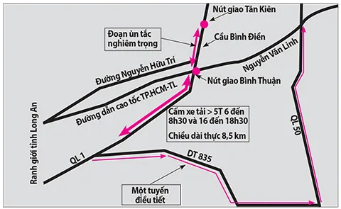 Hướng điều tiết theo đường DT835 đi quốc lộ 50 đến Nguyễn Văn Linh.Đồ họa: LH