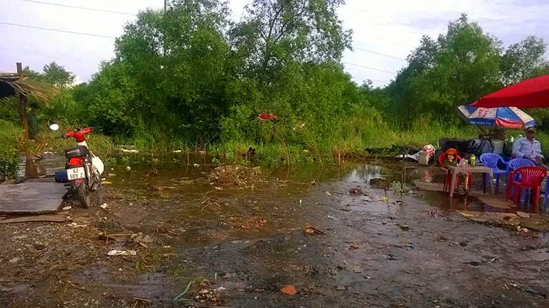 Nước từ sông tràn qua khu đất trống này, chảy ra đường gây ngập. Ảnh: CTV