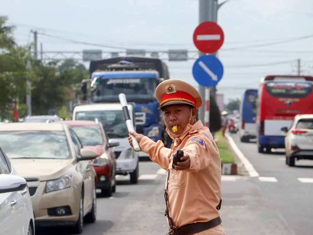 Lực lượng CSGT TP Cần Thơ có mặt tại điểm ùn tắc để điều phối giao thông.