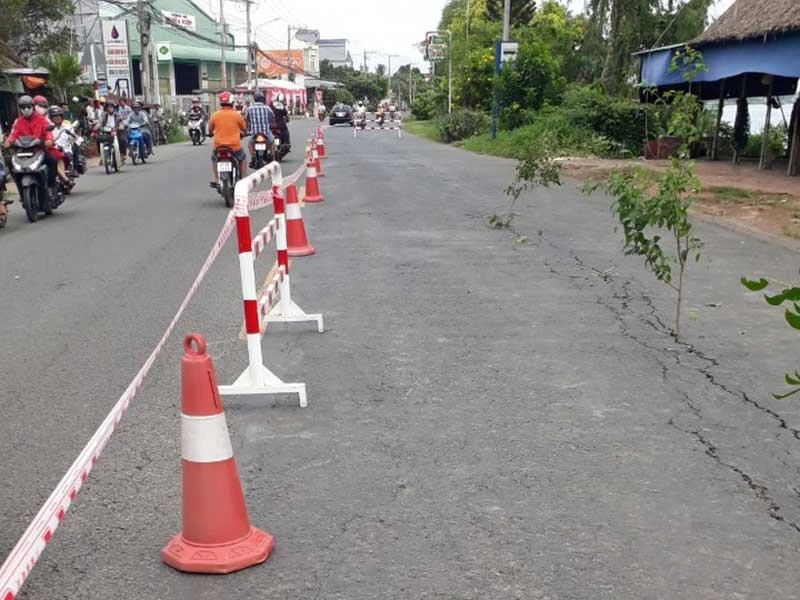 Khu vực xuất hiện vết nứt trên QL91 đã được rào chắn nhằm ngăn các phương tiện đi vào. Ảnh: H.DƯƠNG
