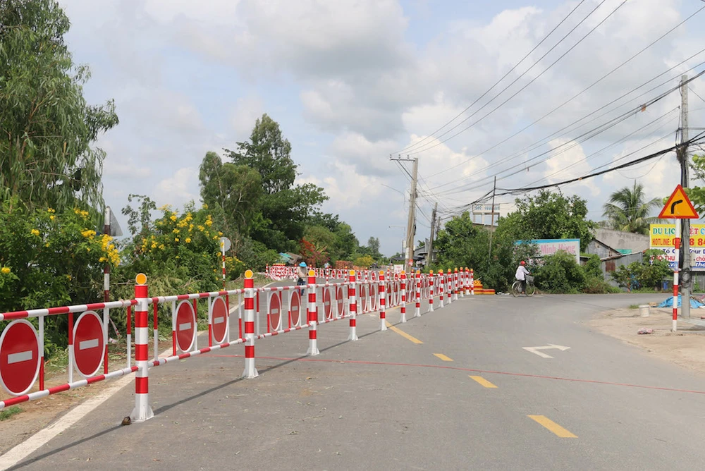Ngành chức năng lắp hàng rào cảnh báo, hạn chế phương tiện giao thông đi vào khu vực có nguy cơ sạt lở. Ảnh: HD